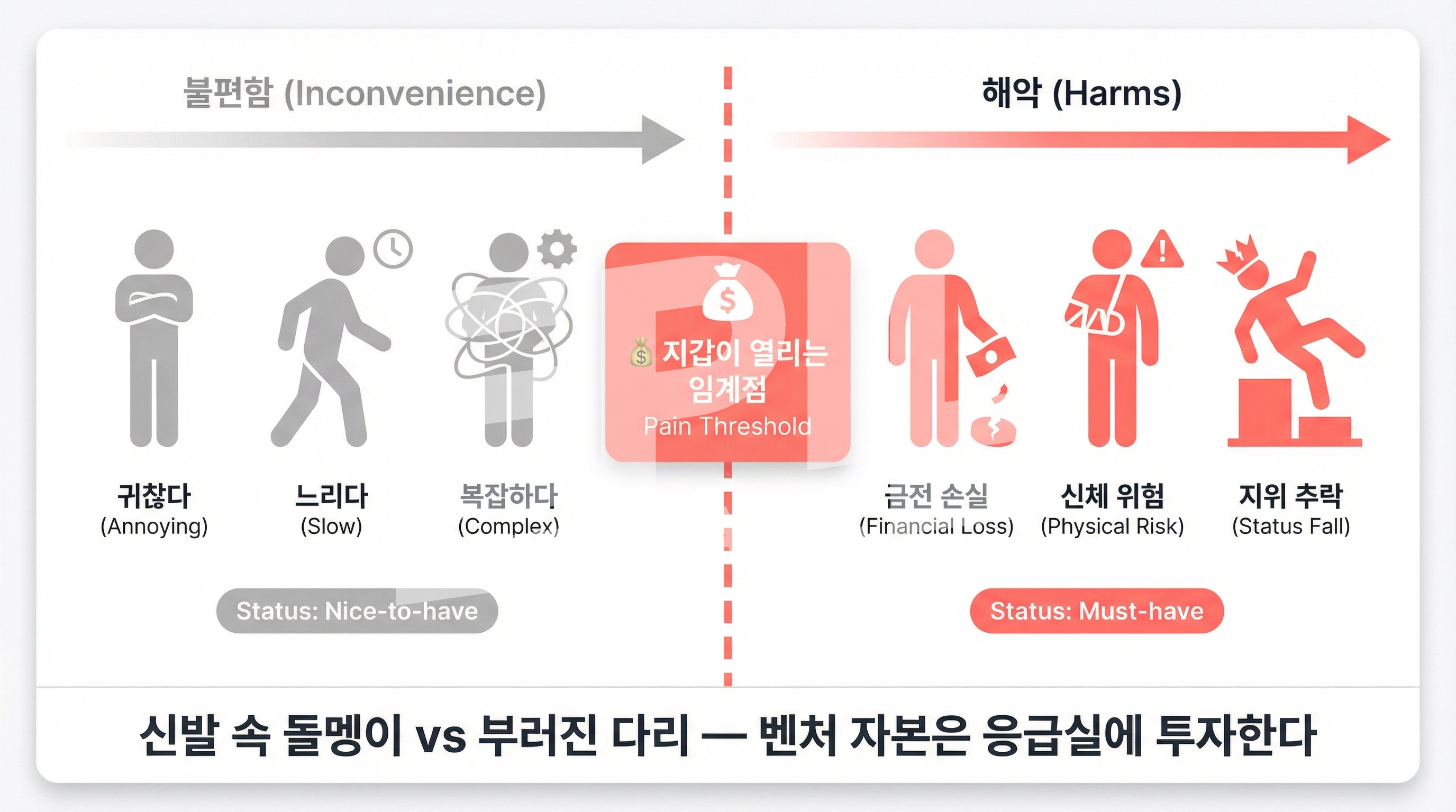 "불편합니다"는 약해요. "죽을 것 같습니다"가 강해요. 투자자는 "있으면 좋겠다" 수준의 문제에 투자하지 않아요. "없으면 못 산다" 수준의 고통을 증명해야 해요.