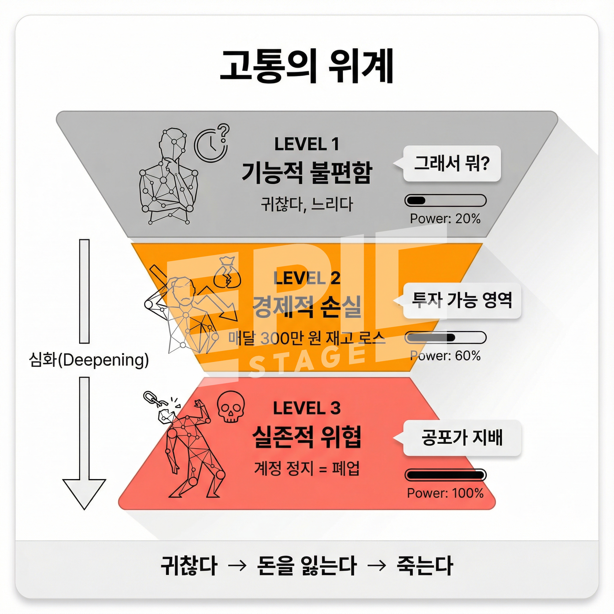 | 3단계 | 생존적 고통 | "사업이 망한다", "경쟁에서 탈락한다" | 높음 |