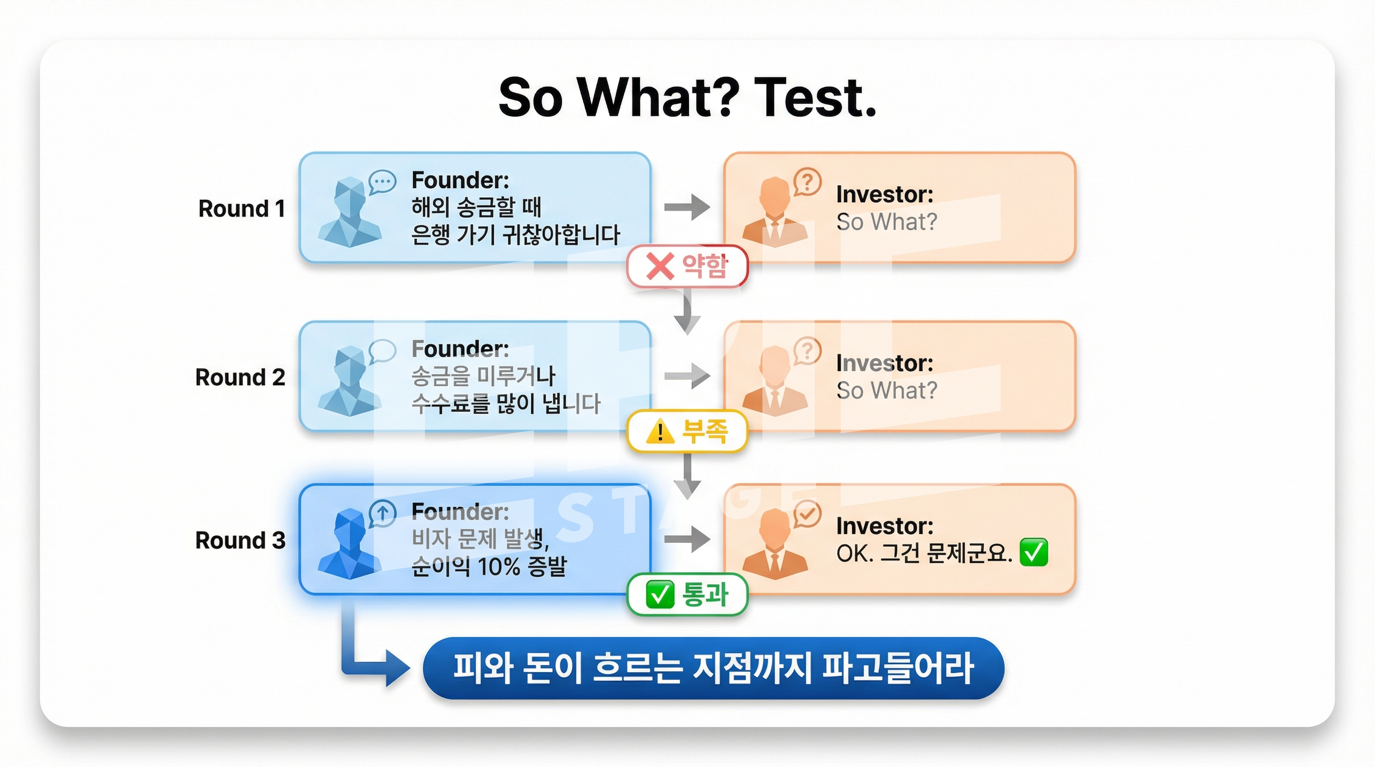 So What 테스트는 고통 논증의 설득력을 검증하는 방법이에요. 창업자가 문제를 설명할 때마다 "그래서요?(So What?)"라고 물어보고, 대답이 막힐 때까지 반복해요. 대답이 빨리 막히면 논증이 약한 거예요.