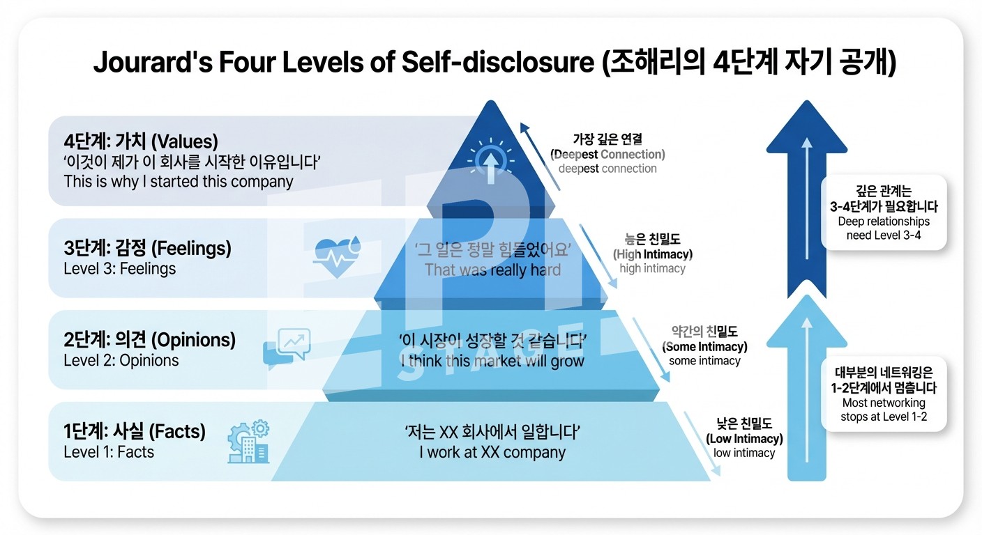 대부분의 네트워킹 대화는 1~2단계에서 머물러요. 이름, 회사, 직함, 하는 일, 시장 전망. 명함에 적힌 것 + 약간의 업계 이야기. 관계가 형성되려면 3~4단계로 가야 해요.