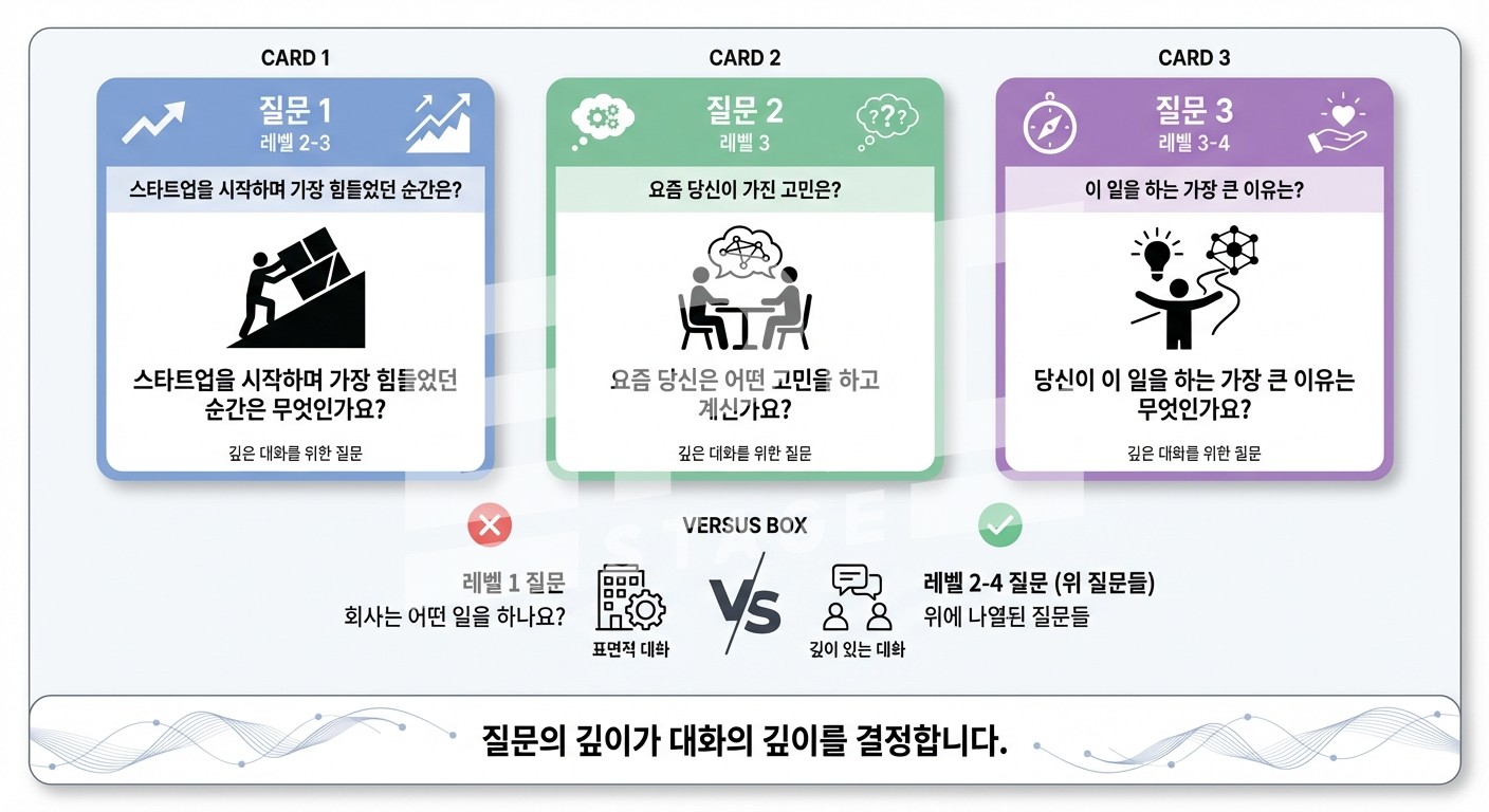 명함 17장을 받았는데 기억나는 사람이 1명이에요. 나머지 16명과의 대화는 왜 기억에 남지 않았을까요? Depth 단계는 피상적 대화를 깊은 대화로 바꾸는 구조를 설계하는 거예요.