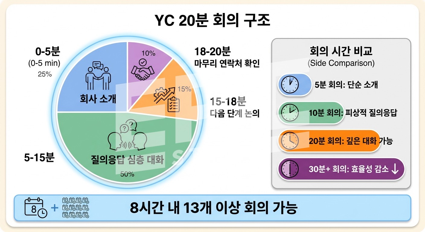 Y Combinator는 스타트업-투자자 미팅을 정확히 20분으로 설정했어요.