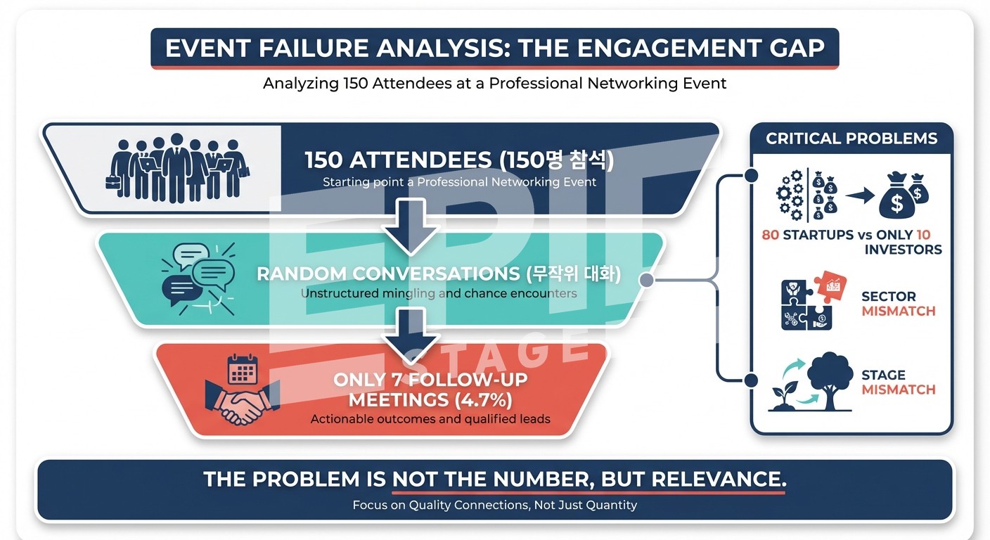 "많이 만나면 좋겠지"는 실패 공식이에요. 500건의 명함 교환에서 7건의 후속 미팅만 나왔다면, 양이 아니라 적합성의 문제예요. 100명의 잘못된 만남보다 10명의 적합한 만남이 나아요. Relevance over Scale — 규모보다 관련성이에요.