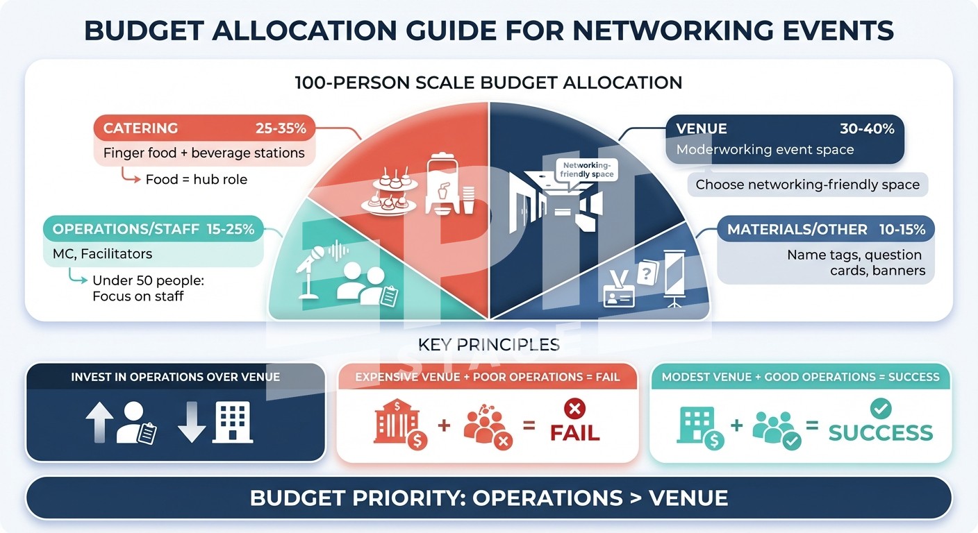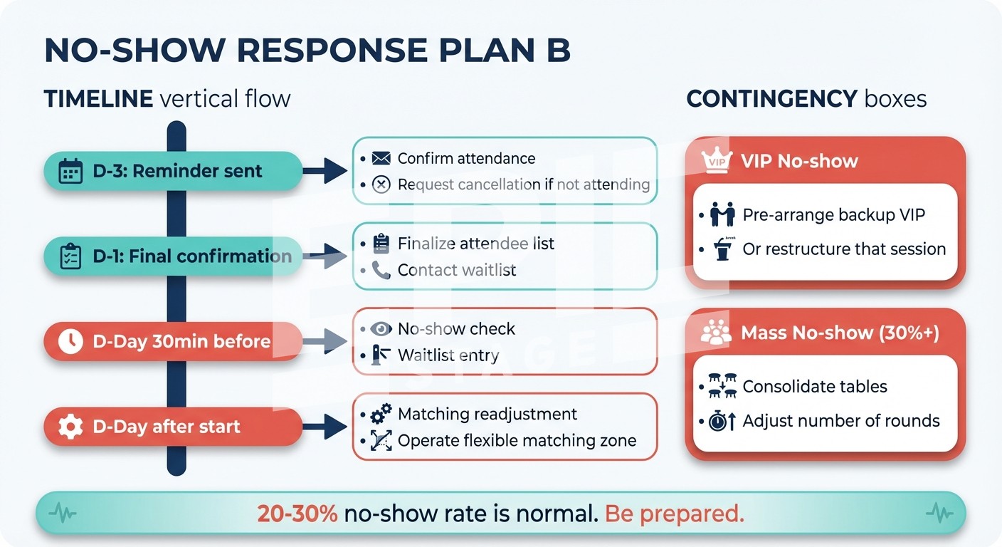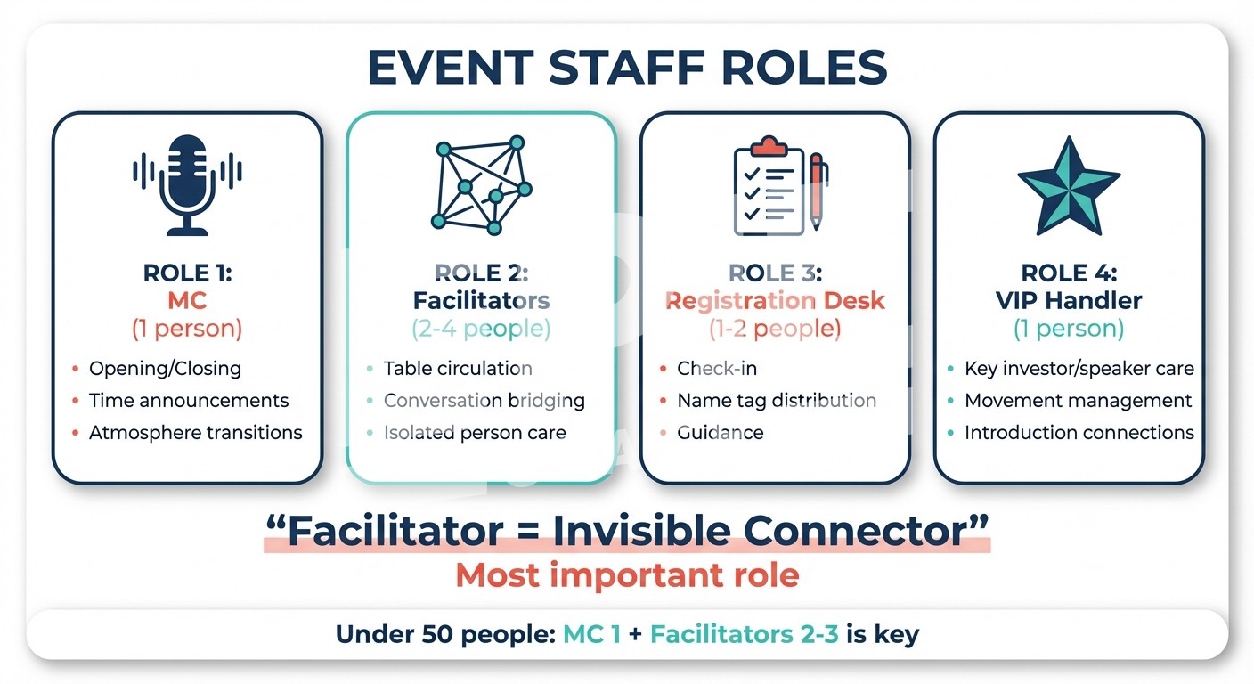 퍼실리테이터가 참가자 25~30명당 1명 배치되어 고립자를 발견하고 대화를 연결해야 네트워킹이 일어나요. 아이스브레이킹, 브릿지 소개, 그룹 합류 유도 등 구체적인 개입 기술이 필요해요.