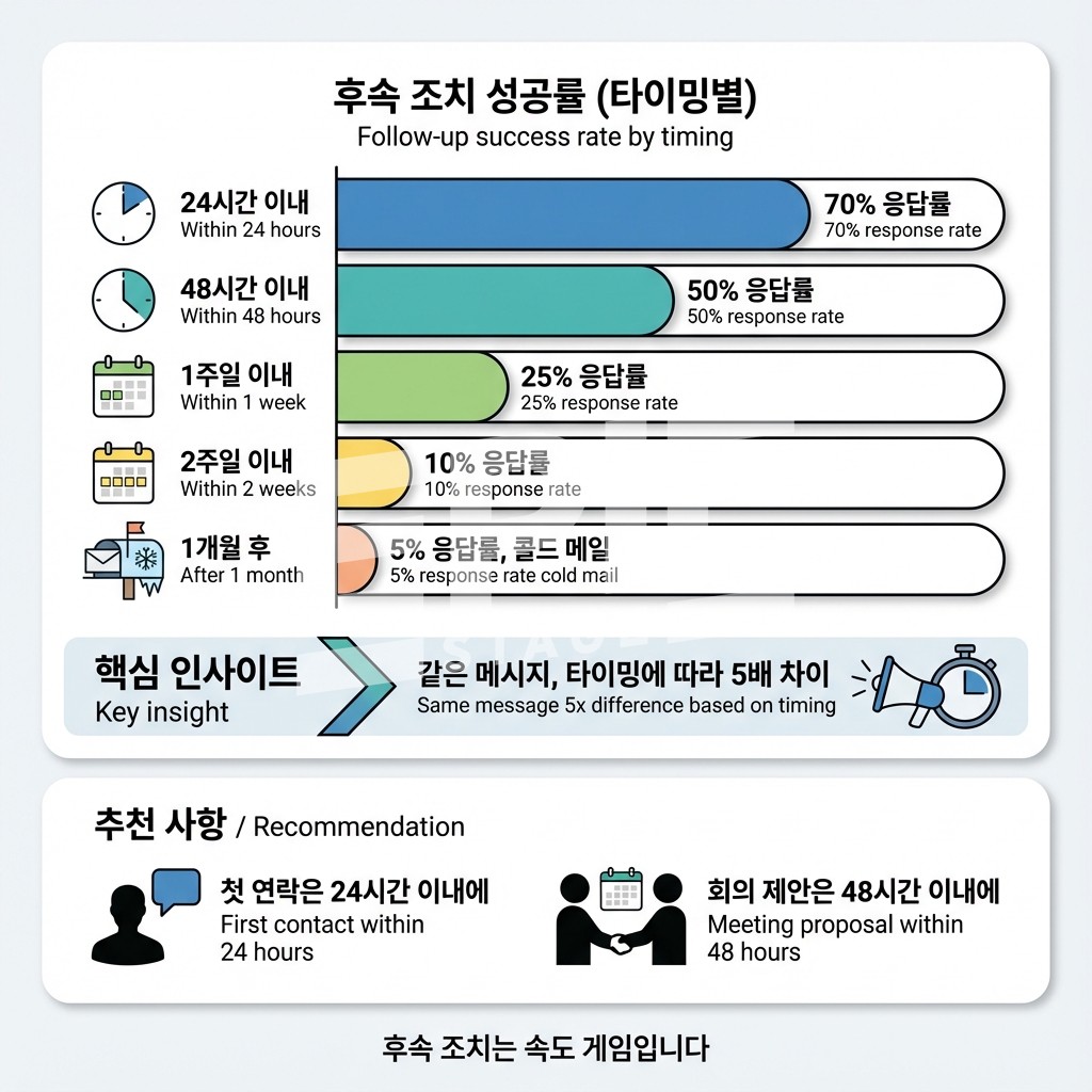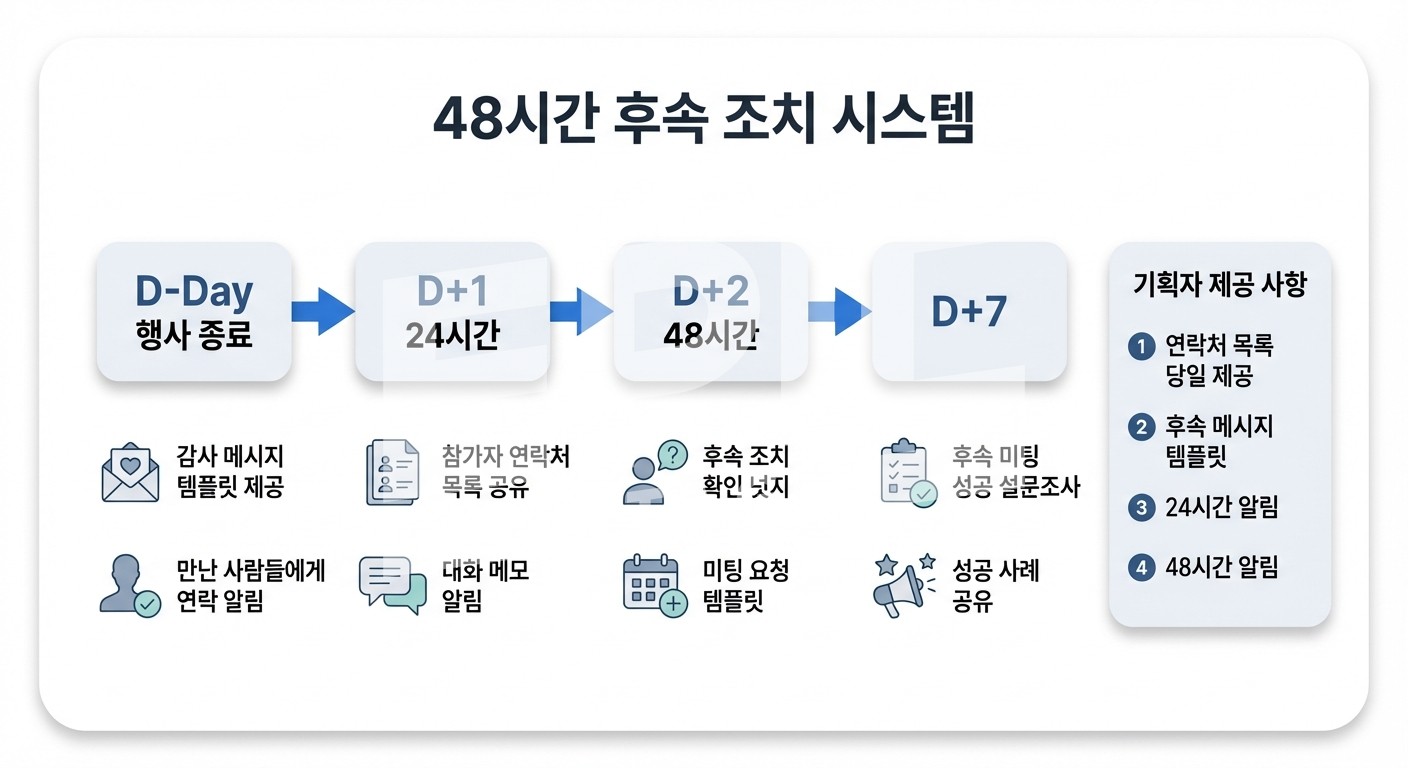 48시간 룰: 네트워킹 후 48시간 이내에 팔로업해야 해요. 이 시간이 지나면 연결 확률이 급격히 떨어져요.